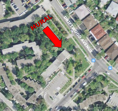 This mural adorns the wall of the end unit at 292 Grandravine Drive, part of Yorkwoods Village. It faces Driftwood Avenue.