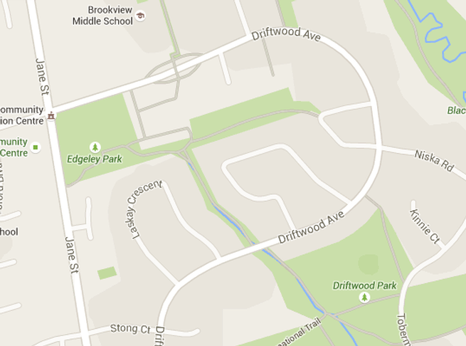 The Driftwood Community Centre is located in the big green square facing Jane Street. This satellite photograph (right), shows how the building and parking lot take up a fair bit of that square.