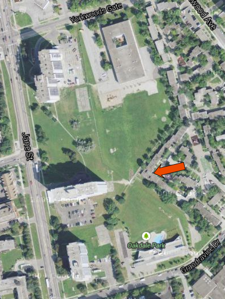 (Image) The red arrow points at the Boys and Girls Club, which is a corner unit. The big red “S” is Yorkwoods Public School. Note the green space stretching between the school and south down to Oakdale Park, which includes the Community Centre facing Grandravine Drive. This field is open to the public.