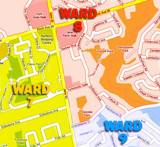 The City of Toronto has divided the area known as Jane-Finch among three Wards. The “crossroads” where these three boundaries meet is located just minutes south of the Jane-Finch intersection, over by the three way traffic lights at Jane and Grandravine. The largest portion of Jane-Finch is located in Ward 8. For example, it includes everything north of Finch all the way up to Steeles.